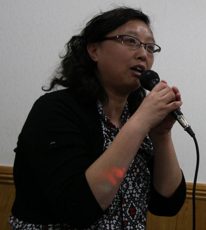 芝加哥安徽同乡会会长、大芝加哥地区中国和平统一促进会副会长、任新民院士的外孙女王亚勤,流着眼泪,发言,