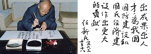 尽管任老于1956年即被钱学森抽调至国防部五院工作,但他对炮兵工程系以及分建后的南京理工大学各个时期的发展都给予了极大的关心和支持,并经常回学校探望、指导,每次回来都感慨学校变化很大。1984年11月,任老被我校聘任为名誉教授。1993年、2003年,任老作为特邀嘉宾回校参加校庆40周年和50周年庆典,并为学校题词祝贺。2002年10月18日在南京参加活动期间还特地到我校看望兵工学校的同学肖学忠、学生金家骏,并参观了国防重点实验室。2005年9月,任老专门来到我校火箭工程实验室,并听取学科带头人周长省教授作的学科专业发展情况介绍。从任老在交谈中的专注与肯定中可以看出,他依然情系着自己创建的这个火箭专业。2013年3月,年近百岁的任老还专门为我校重新布展的校史展览馆题写馆名。