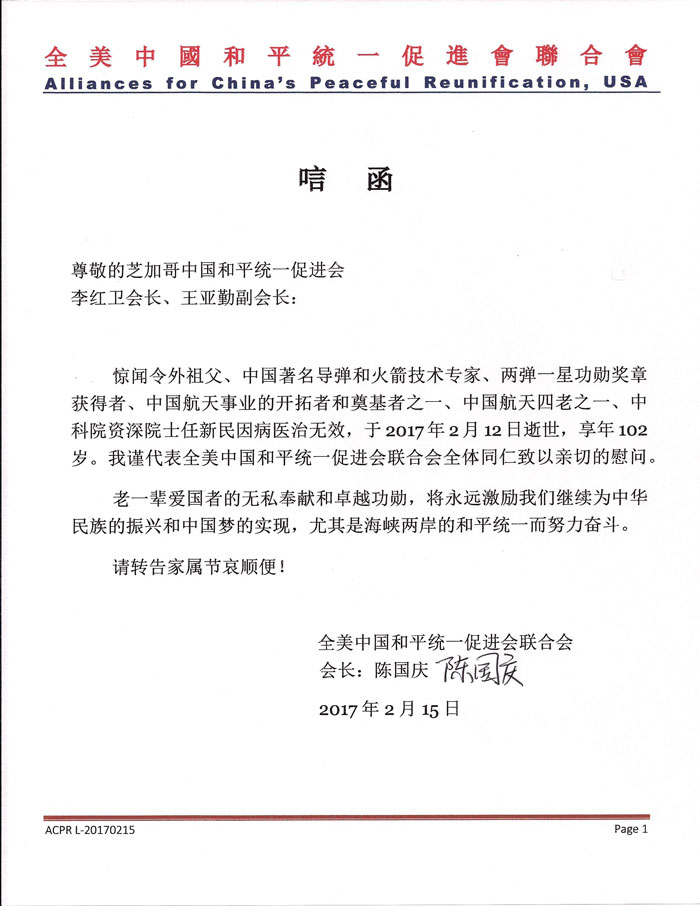 全美中国和平统一促进会联合会的唁电