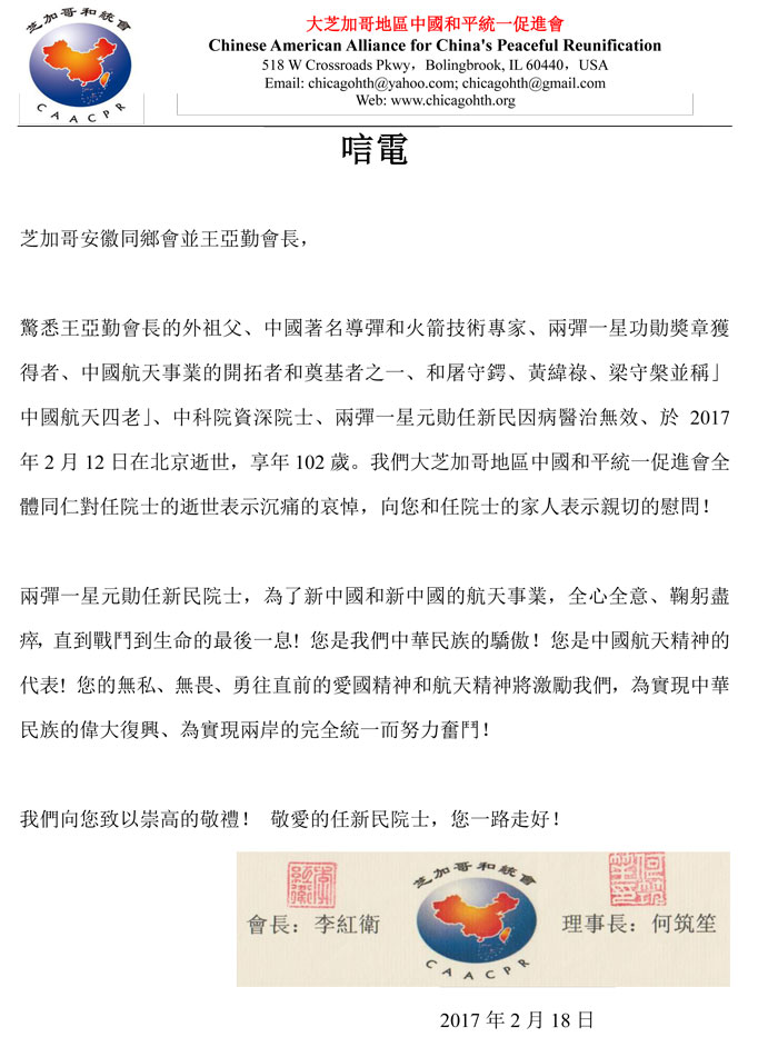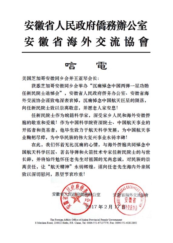 新聞稿: 芝加哥安徽同乡会: 沉痛悼念中国两弹一星元勋任新民院士!