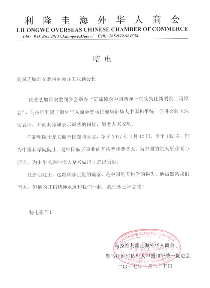 马拉维利隆圭海外华人商会暨马拉维华侨华人中国和平统一促进会的唁电