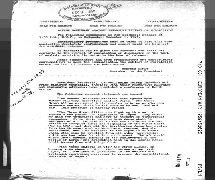 《开罗宣言》(Cairo Declaration1943121日,请阅读全文)。在《开罗宣言》中、美、英三国元首签署:”我三大盟国此次进行战争之目的,在于制止及惩罚日本之侵略”。 ”三国之宗旨在剥夺日本1914第一次世界大战开始后在太平洋上所夺得或占领之一切岛屿,在使日本所窃取于中国之领土,例如满洲、台湾、澎湖列岛等,归还中华民国。”
